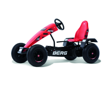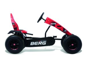 Kart de pedales BERG XL B.Super Red BFR . Un kart de pedales muy popular tanto por los particulares como para las empresas de eventos. Los karts de pedales BERG vienen con ruedas de neumático para desplazarse por caminos de tierra o asfalto sin dificultad. El chasis del kart de pedales es de color negro, tiene el asiento ajustable color red, además el cubre cadenas, el spolier delantero de color red y cuenta con guardabarros traseros resistentes.